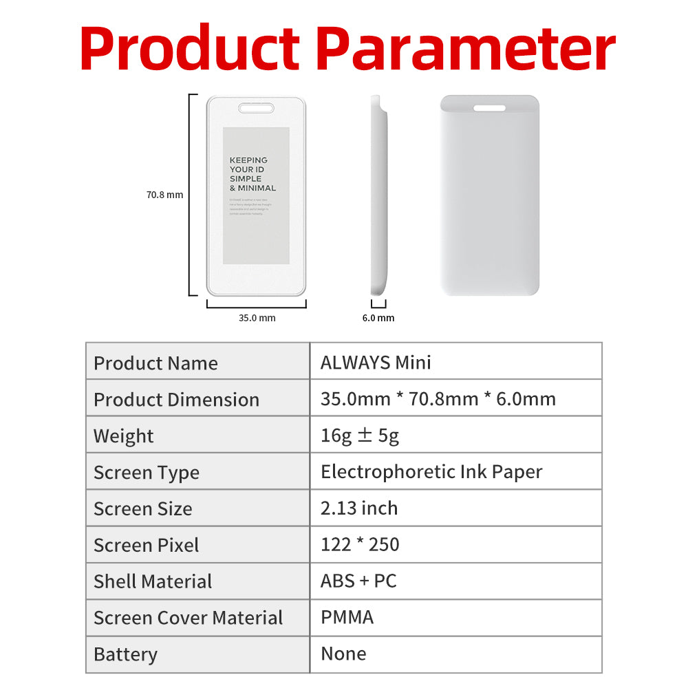 Always Card is based on the electronic paper ink screen as a display screen, it meets the current needs of energy saving, environmental protection and healthy eye protection. It adopts 2.13 inch display screen, which is moderate in size and easy to carry. It can be used in various scenarios, such as home, office, business, and is suitable for the elderly, teenagers and children. The product is light and thin, easy to operate, and can replace paper and sicky notes to some extent and so on.